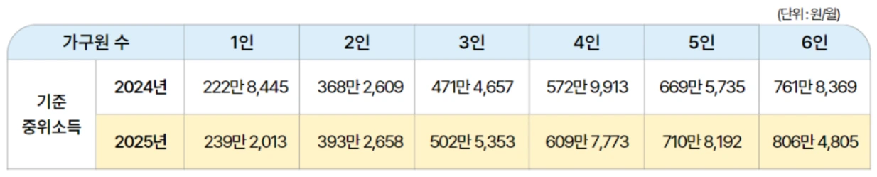 - 4인 가구 생계급여: 2024년 183만 3,572원 → 2025년 195만 1,287원 (6.42% 인상)
